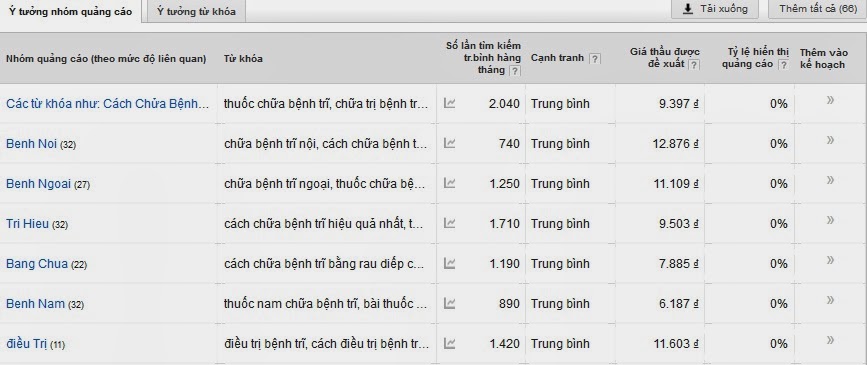 Các bạn Vào Google Keyword Planner nhập từ khóa và nhận ý tưởng từ khóa theo nhóm, xuất ra file CSV.