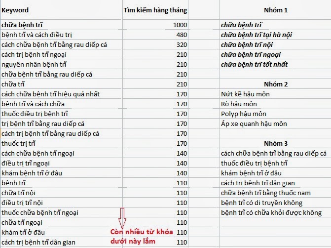 - Còn ở bên trái là các từ khóa được dùng để tham khảo, khoảng 200 từ được lọc ra từ 800 từ do Google gợi ý. Còn nhóm 1 + 2 + 3 được xây dựng dựa trên nhóm này. Chiến thuật của mình là đi từ dễ đến khó, nghĩa là SEO ngược từ nhóm 3, rồi tới nhóm 2, cuối cùng là nhóm 1, trong đó từ khóa chính “chữa bệnh trĩ” để sau cùng. Các từ khóa dài lên có tác dụng khích lệ tình thần SEOer, khách hàng đỡ sốt ruột và mang lại lượng traffic nhỏ nhất định. Nhiều lượng traffic nhỏ sẽ thành lớn.