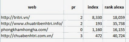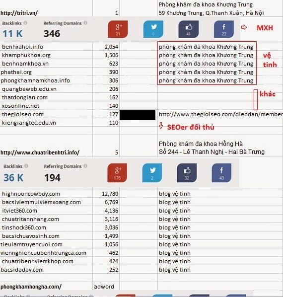 Nhận xét chung đối với cả 4 đối thủ: đều là các phòng khám, trung tâm y tế lớn, link chủ yếu là thông qua hệ thống vệ tinh, ít sử dụng MXh và có chạy adword. Tiện thể check đối thủ, thấy họ có thuê SEO, một trong số các bạn này có tham gia Thế giới SEO, mình liền vào profile và đọc post, comment của bạn này để có cái nhìn toàn diện hơn về đối thủ của mình. Vì thế các bạn làm SEO chú ý, lên diễn đàn SEO, để link chữ kí rồi chỉ nhăm nhăm Spam chỉ khiến đối thủ "nhìn bạn bằng nửa con mắt".