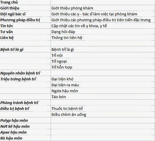 Dựa trên danh sách từ khóa, và các đối thủ đã nghiên cứu các bạn lên khung nội dung cho trang web.