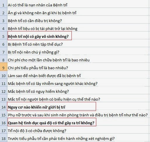 Như ở dưới đây, sơ bộ mình đã liệt kê 18 câu hỏi mà khách hàng quan tâm liên quan tới bệnh trĩ.